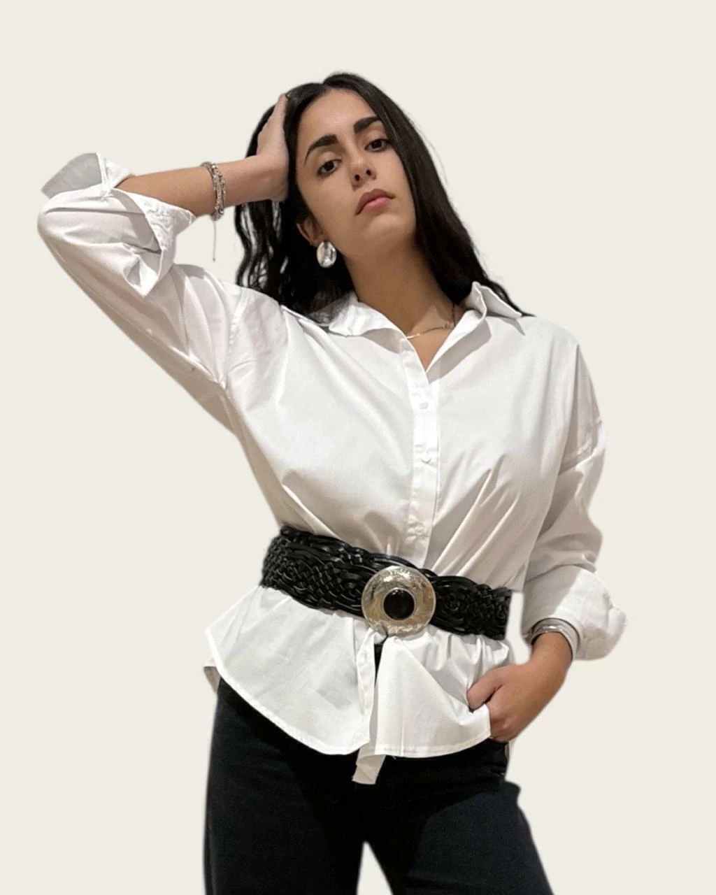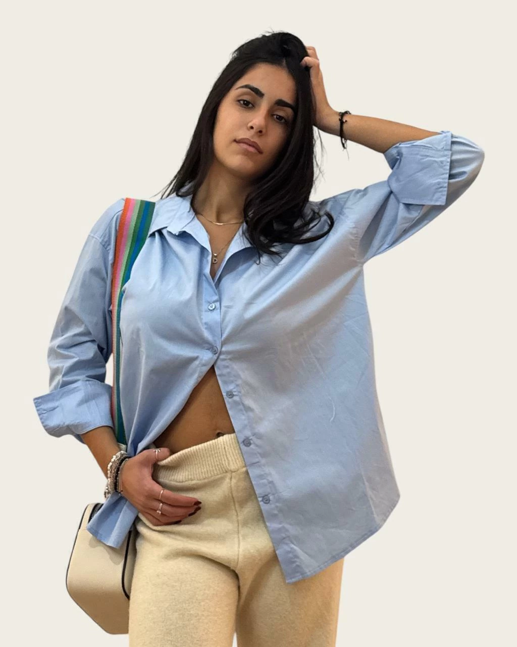 Una prenda básica y versátil que no puede faltar en tu armario. Nuestra camisa celeste de corte amplio combina estilo y comodidad a la perfección. Confeccionada en una tela liviana y suave, presenta un diseño relajado que se adapta a cualquier tipo de cuerpo. Ideal para un look casual o para combinar con prendas más formales, es un must-have de temporada.
